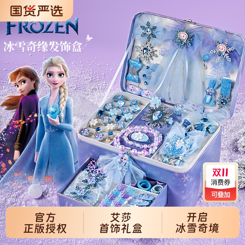 迪士尼冰雪奇缘艾莎公主首饰盒女孩串珠发饰生日礼物玩具豪华装扮