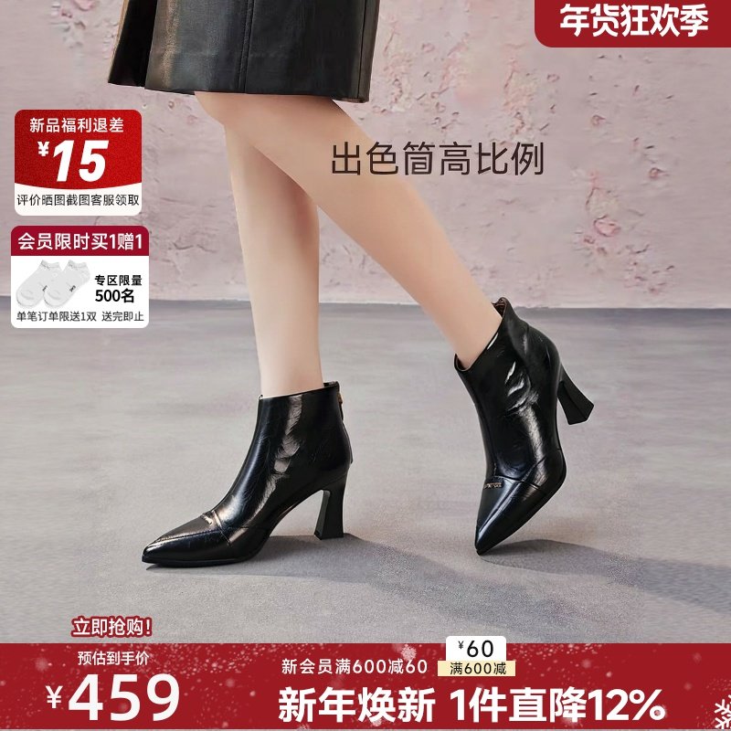 【Lily An x 轻奢手工】尖头粗跟真皮短靴女冬季加绒高跟时装靴子
