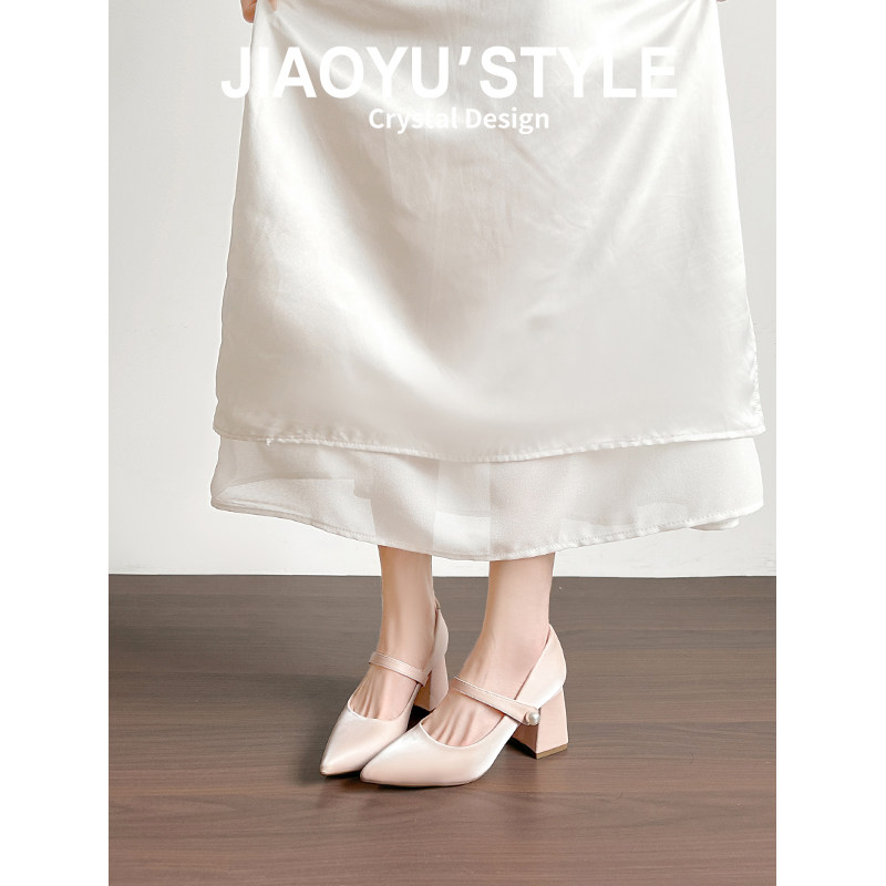 真皮~骄屿裸色尖头粗高跟鞋2026春新款法式绝美玛丽珍鞋珍珠单鞋