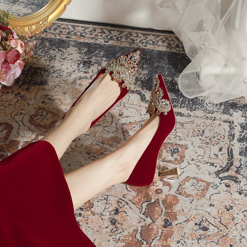 婚鞋新娘鞋不累脚结婚敬酒鞋红色绒面尖头粗高跟鞋女大码2025新款