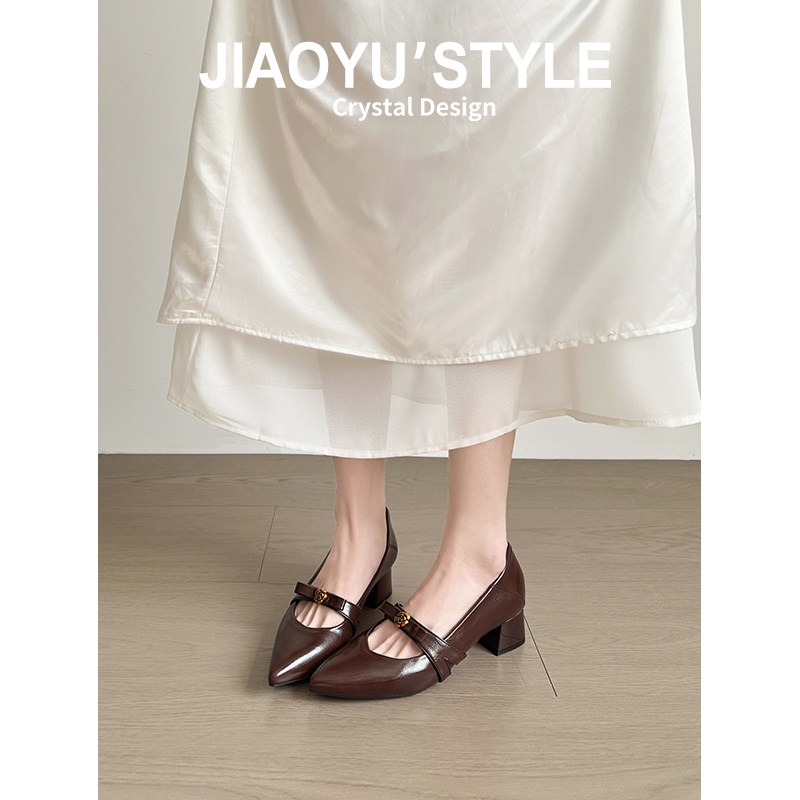 真皮~骄屿 粗跟高跟鞋女尖头玛丽珍鞋春新款小个子高级感法式单鞋