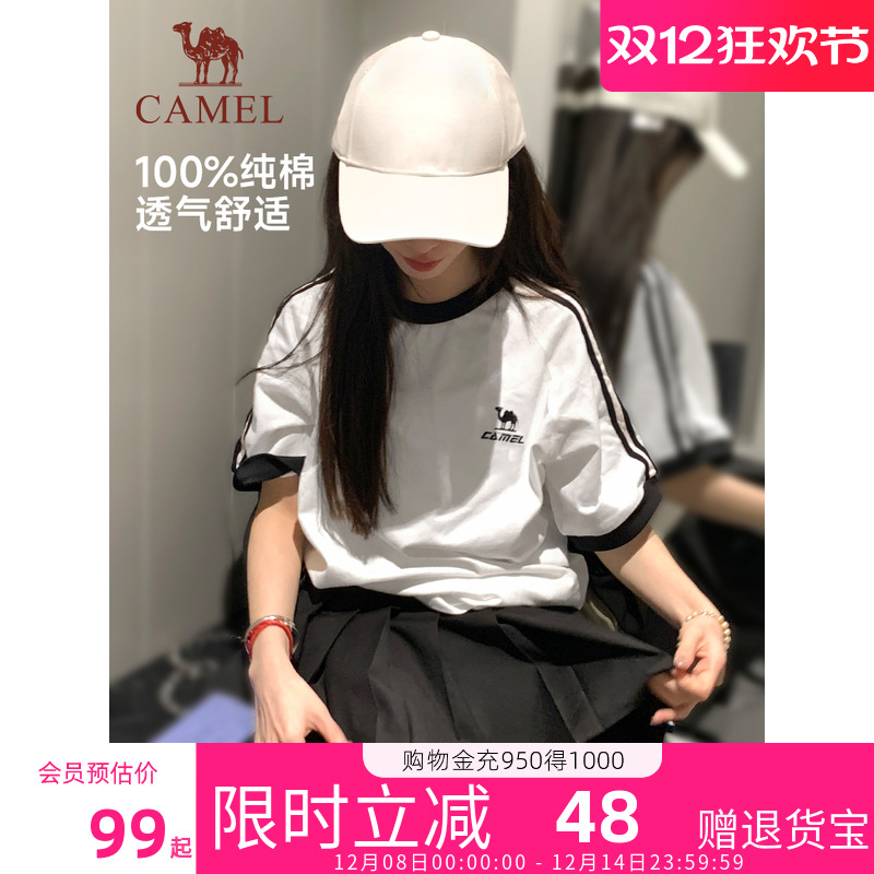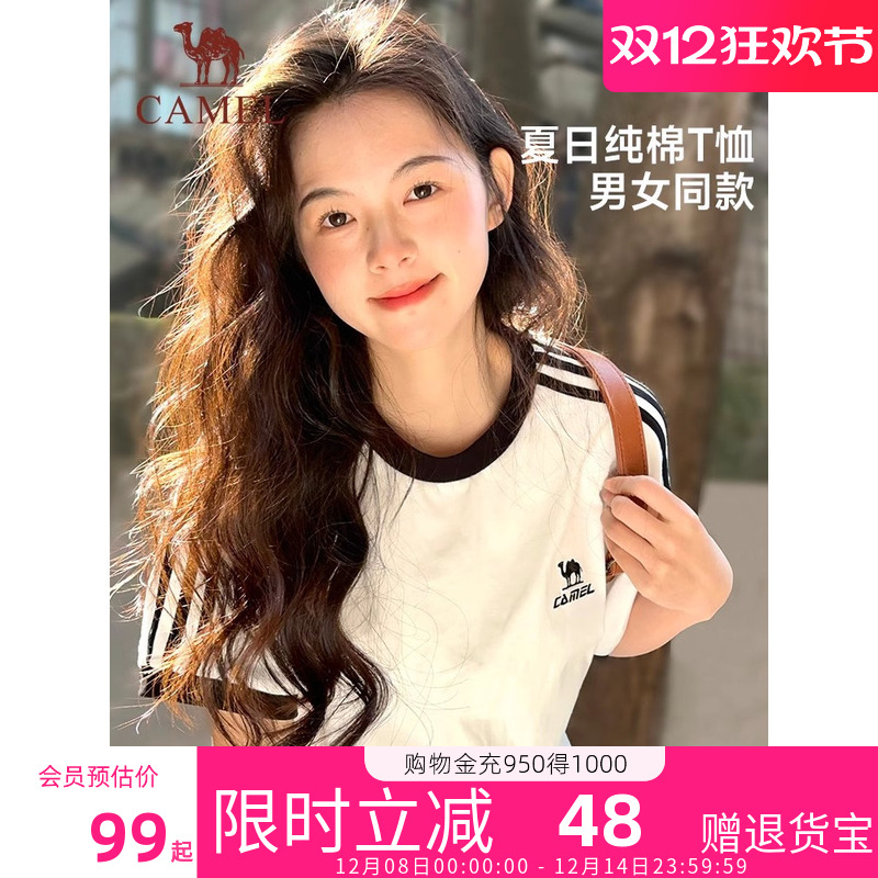 骆驼短袖T恤女2025新款夏季学院风纯棉白色正肩圆领短袖T恤上衣男