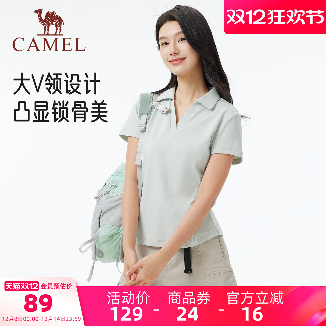 骆驼短袖T恤女装2025夏季新款显瘦高弹透气v领休闲运动polo衫上衣