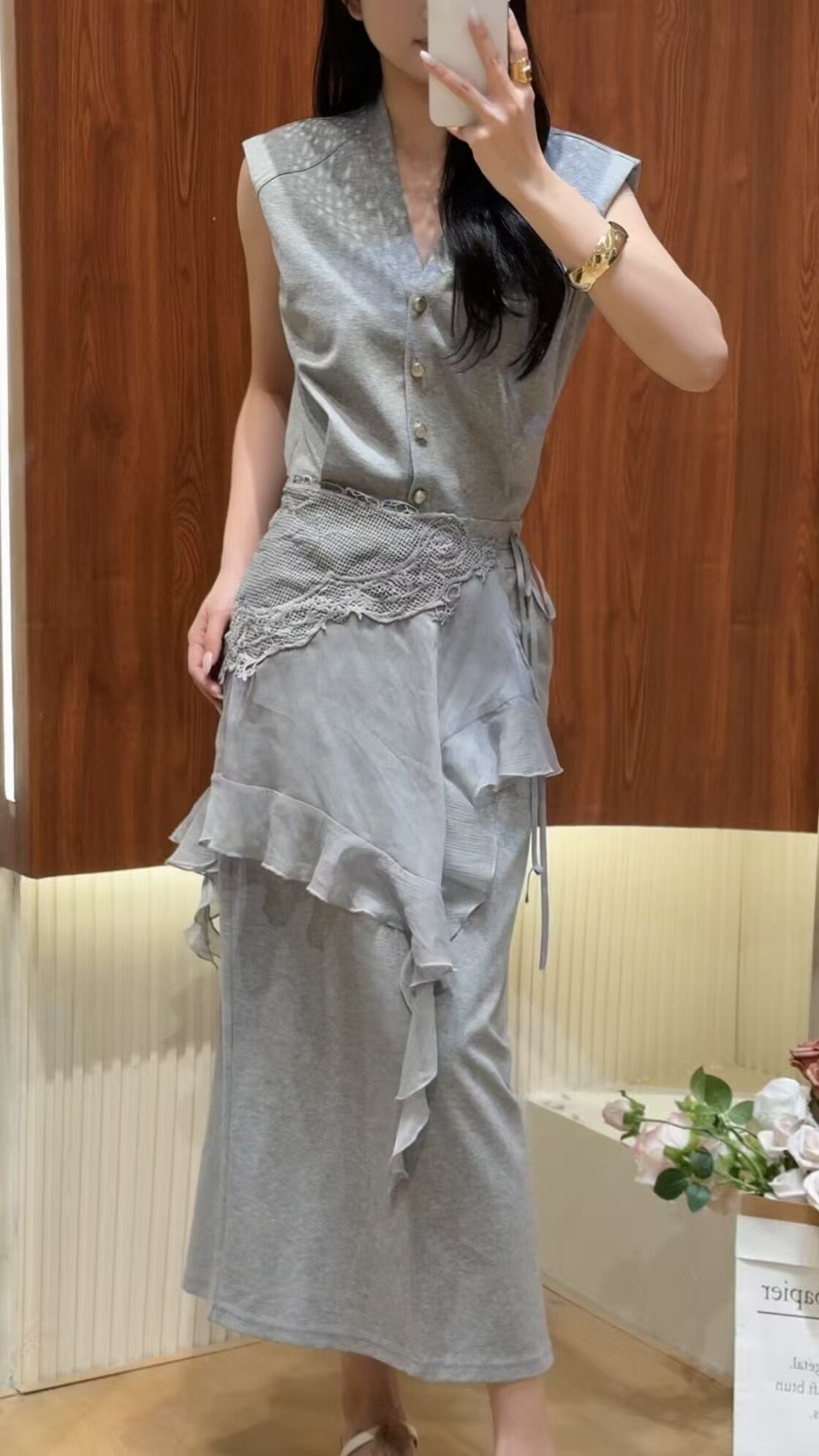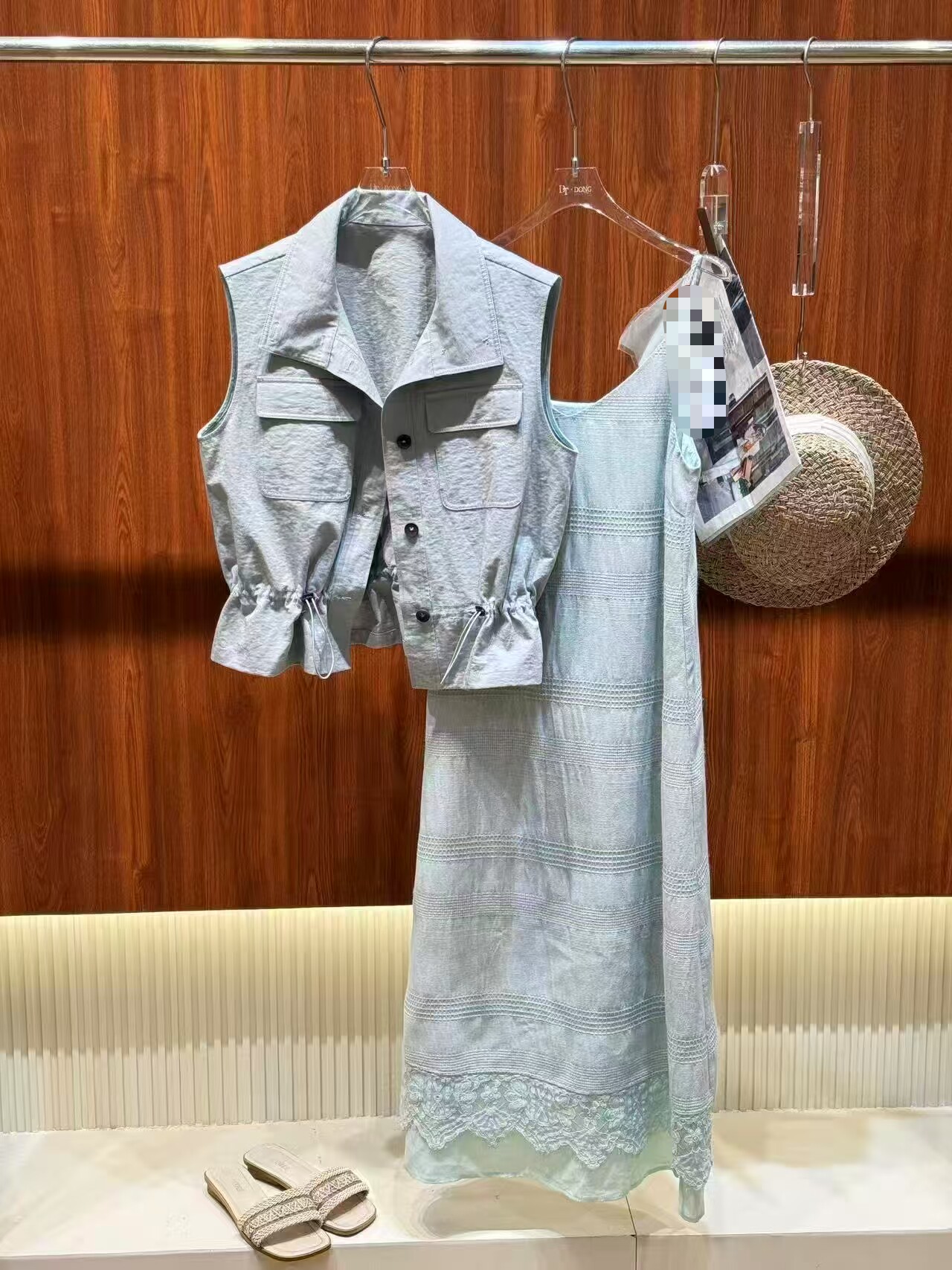 欧洲站2026夏季新款DT.Dong气质翻领无袖马甲蕾丝吊带连衣裙套装