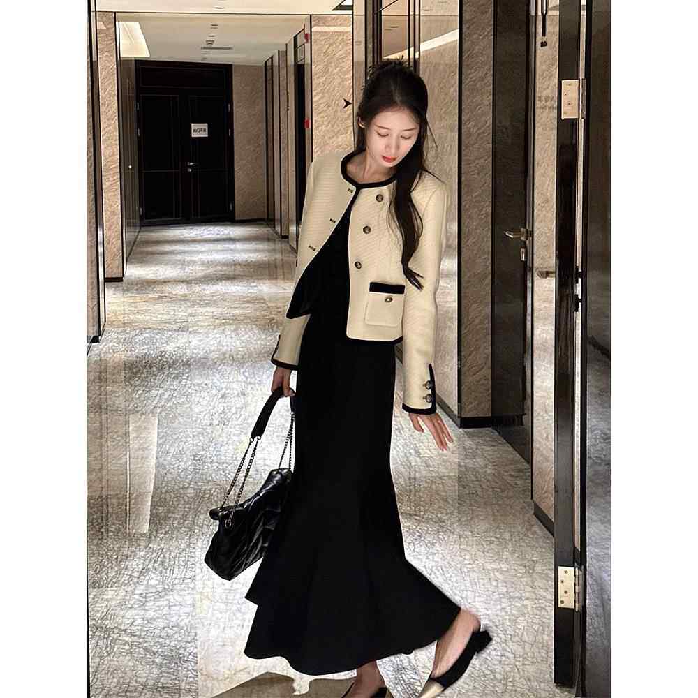 欧洲站秋装女2025新款法式气质修身显瘦黑色鱼尾连衣裙子两件套装