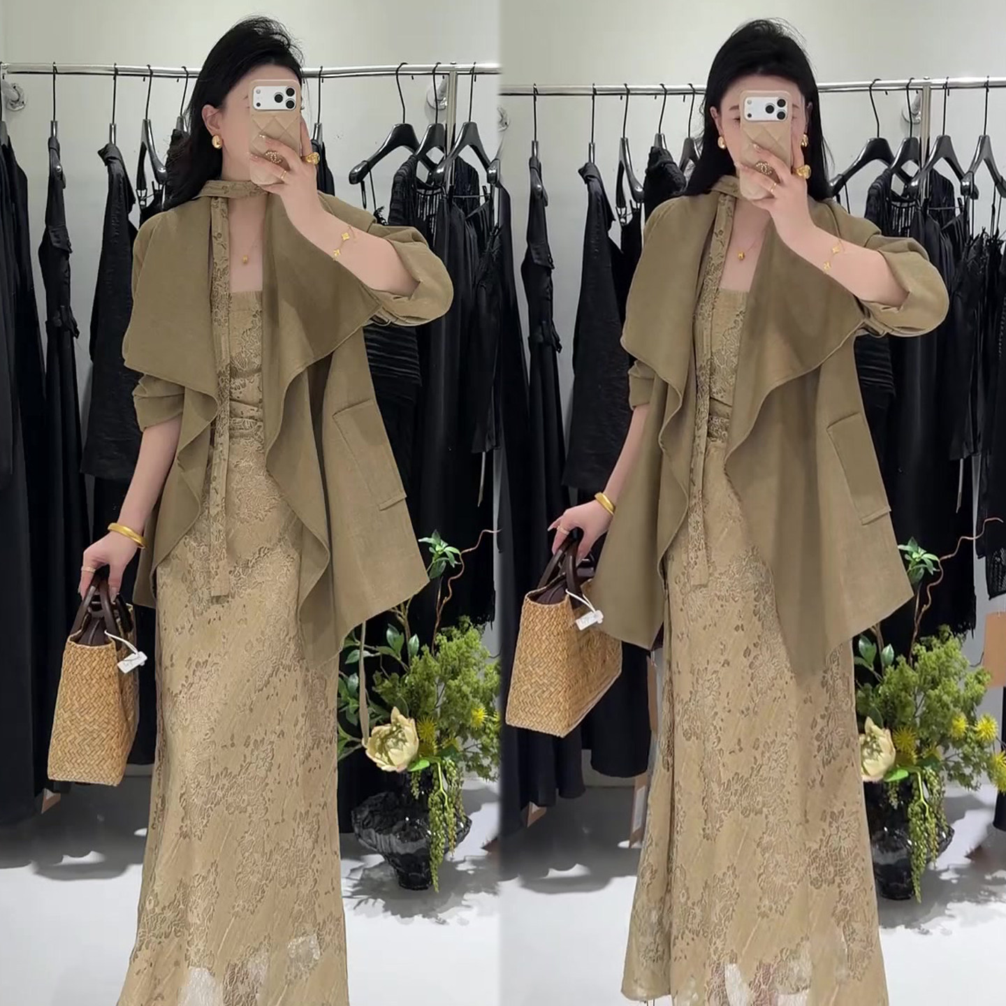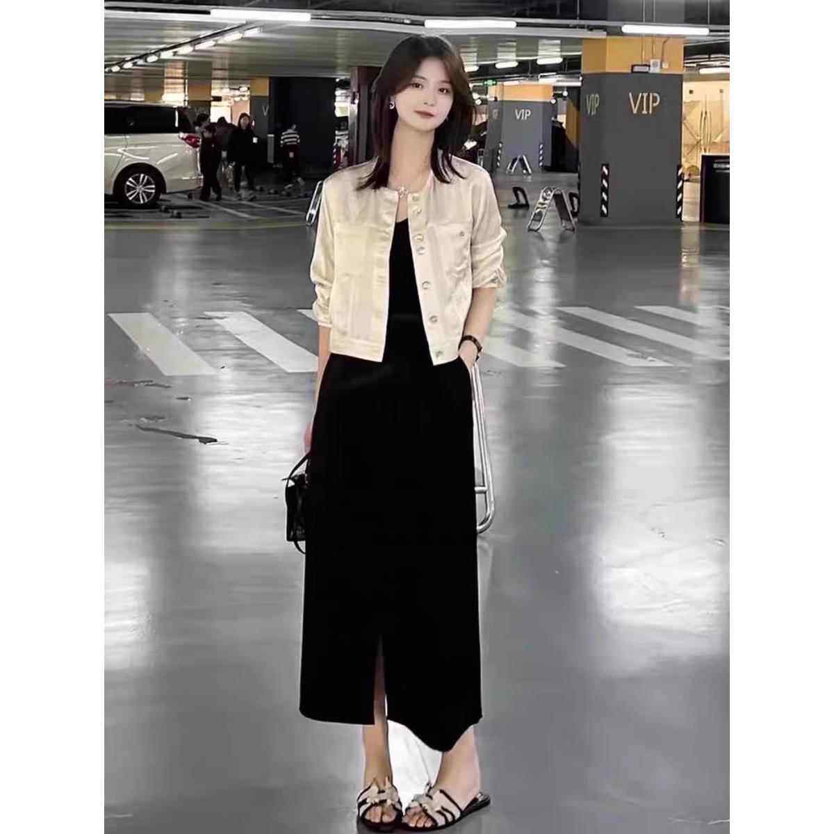 欧洲站2025秋装新款气质知性薄款外套吊带长裙高级感连衣裙套装