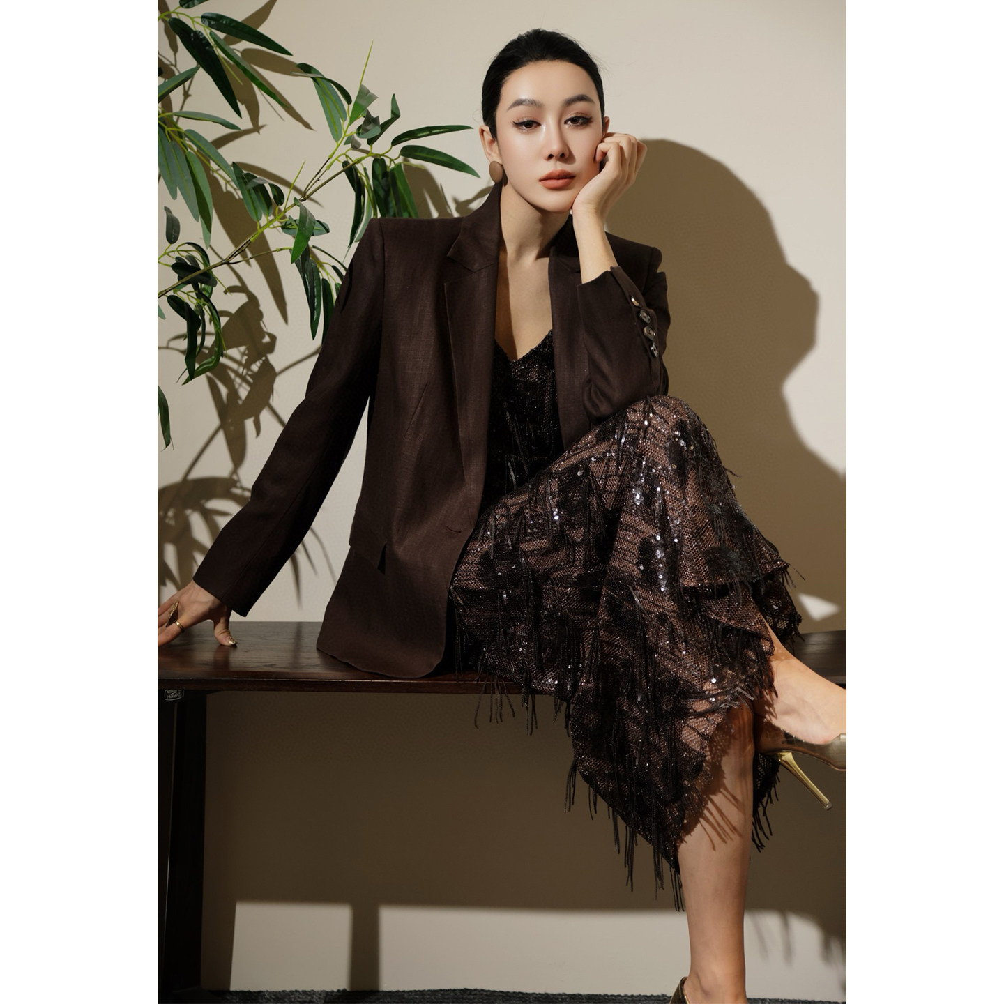 欧洲站女装优雅亚麻西装配流苏连衣裙套装女高级感商务名媛两件套