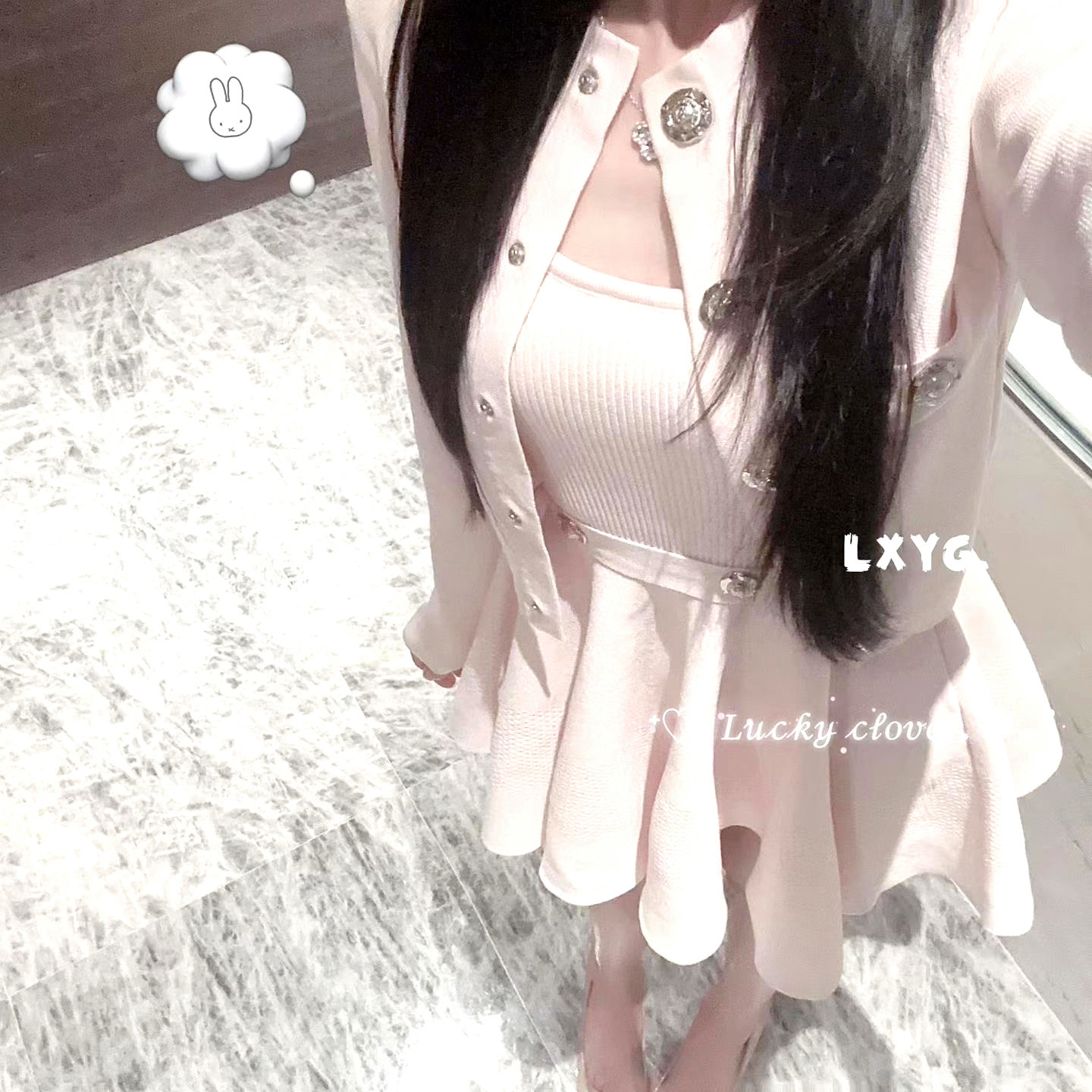 LXYG小香风蝴蝶结吊带连衣裙套装女2026春高级感名媛千金针织开衫