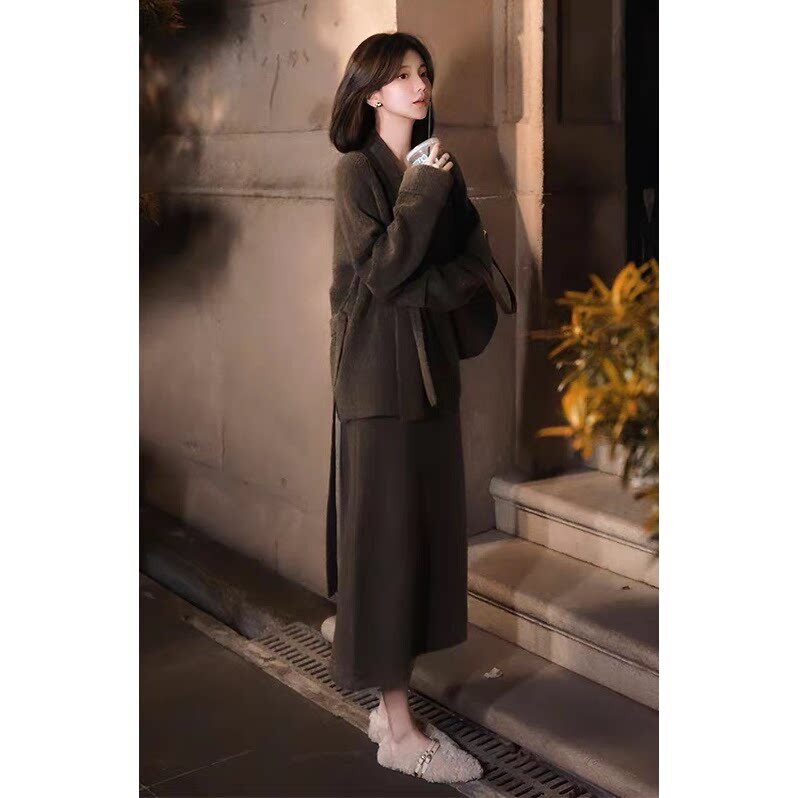 欧洲站秋季穿搭法式独特别致高级感超好看咖色开衫针织连衣裙套装