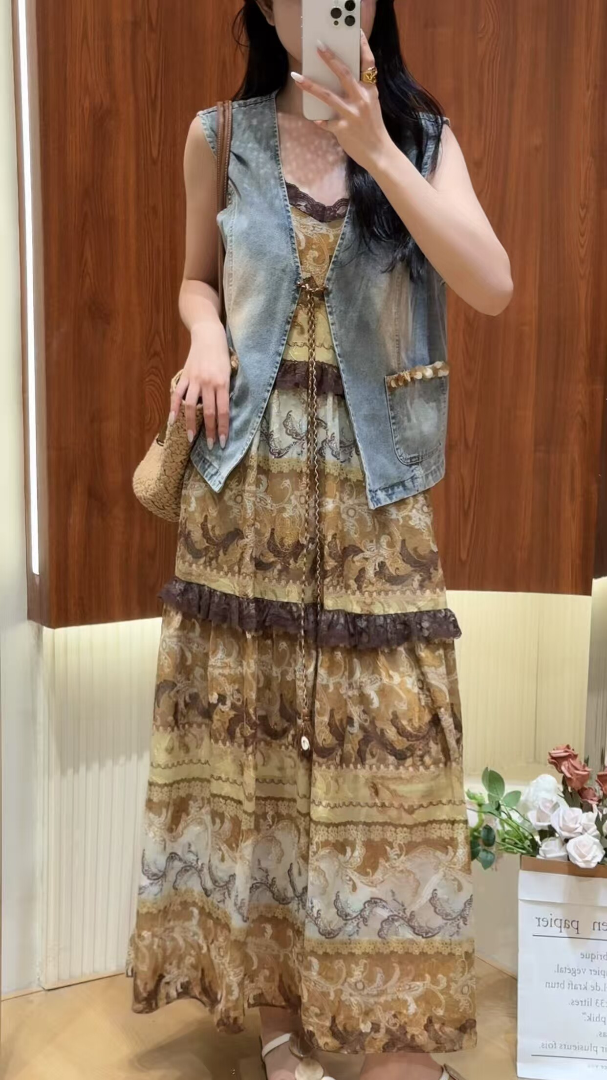 欧洲站2026夏季新款DT.Dong法式气质V领牛仔马甲碎花连衣裙套装女