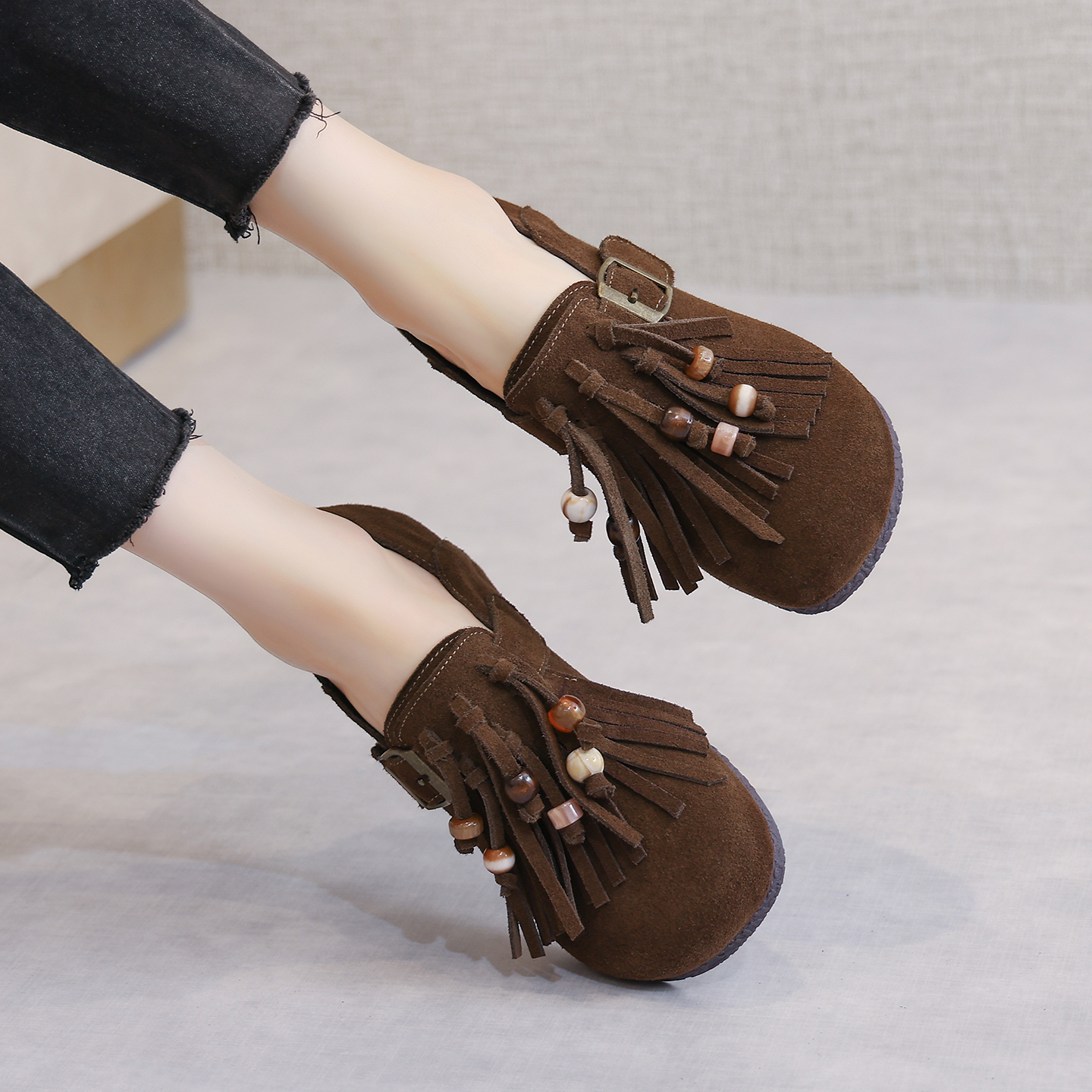 千百度真皮流苏全包勃肯女鞋2025秋季新款复古单鞋一脚蹬乐福鞋