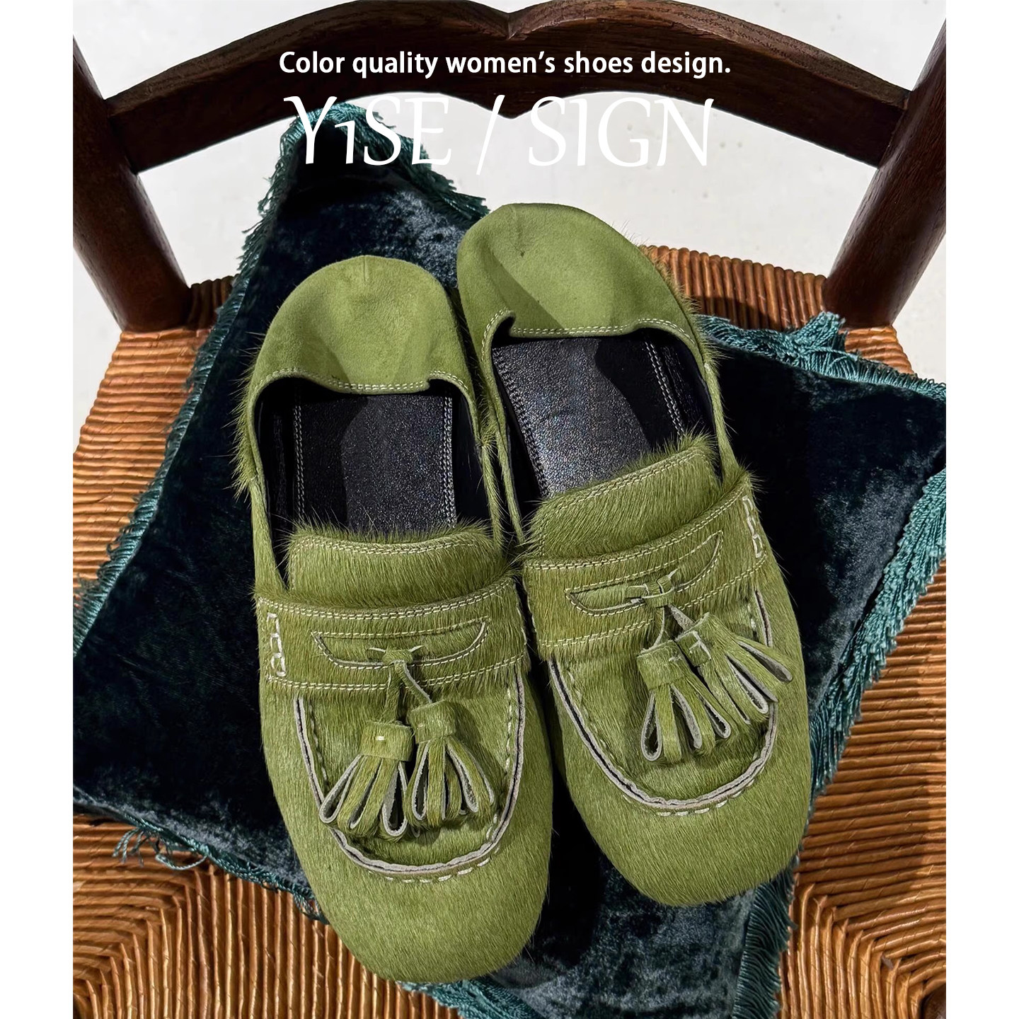 绿色小众流苏马毛平底乐福豆豆鞋女2026新款复古两穿踩脚深口单鞋