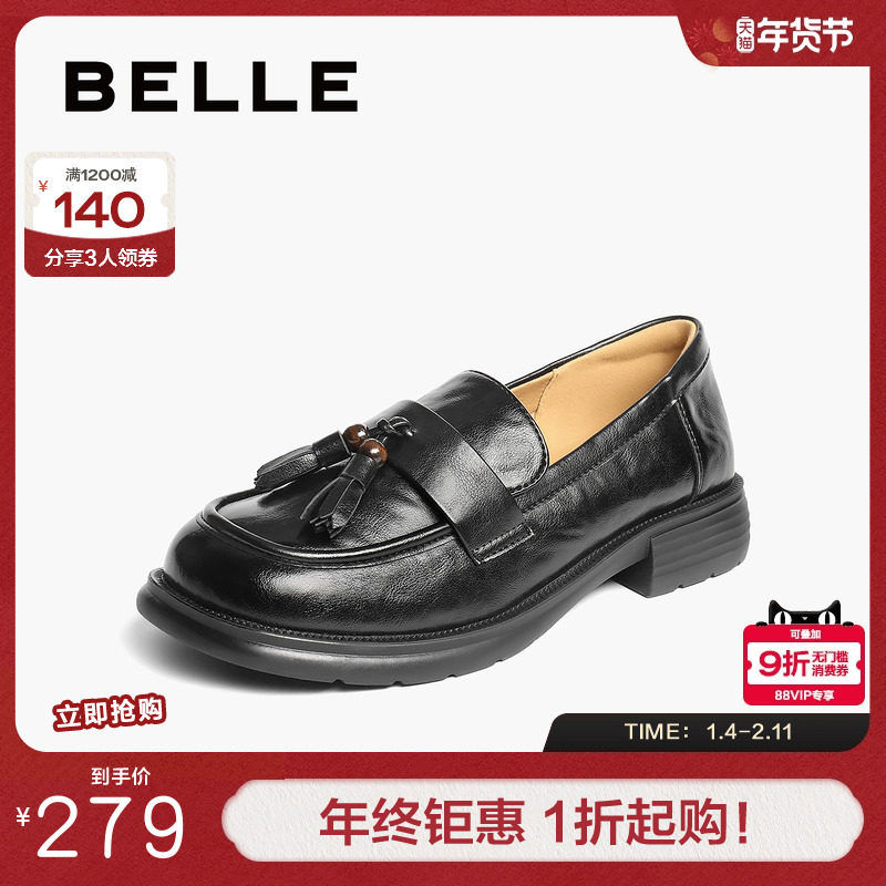 百丽流苏复古乐福鞋女鞋秋季新款黑色小皮鞋深口单鞋子B2788CA5