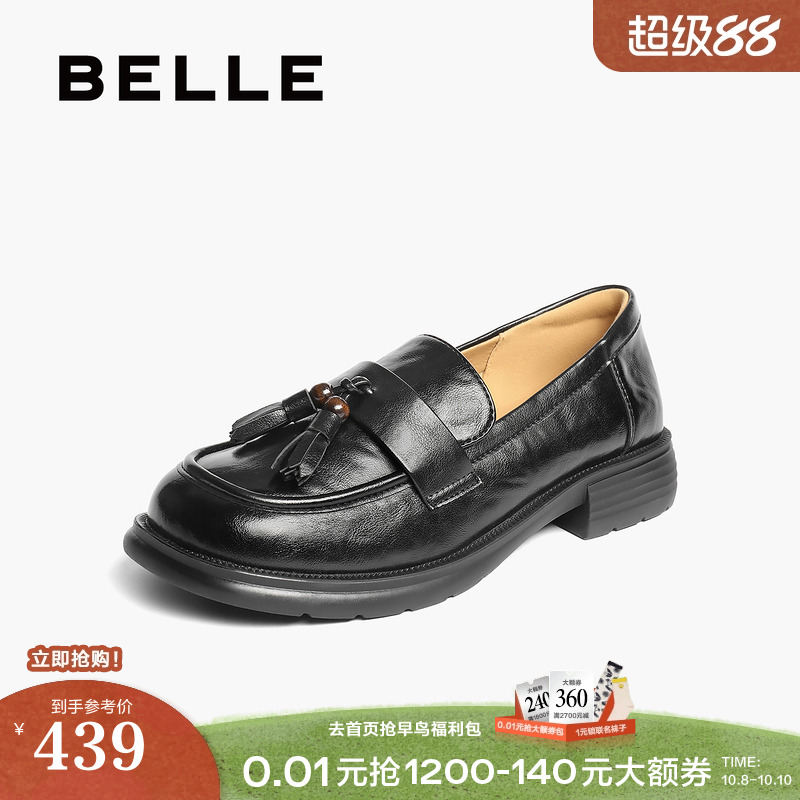 百丽流苏复古乐福鞋女鞋2025新款黑色小皮鞋深口单鞋子B2788CA5