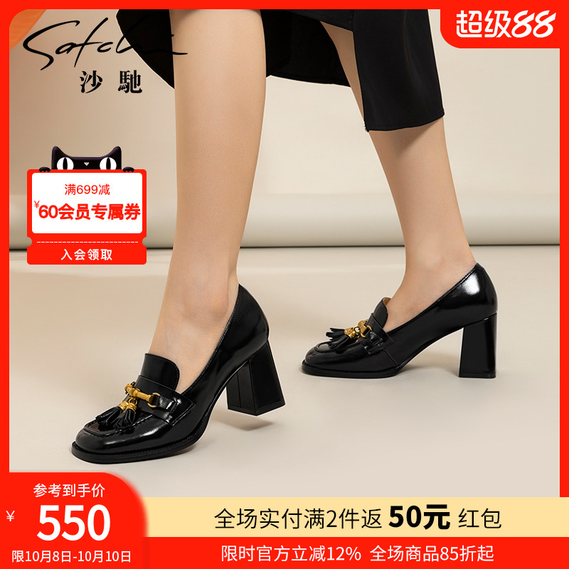 沙驰女鞋小香风粗高跟小皮鞋2025秋新款流苏饰扣职业通勤单鞋方头