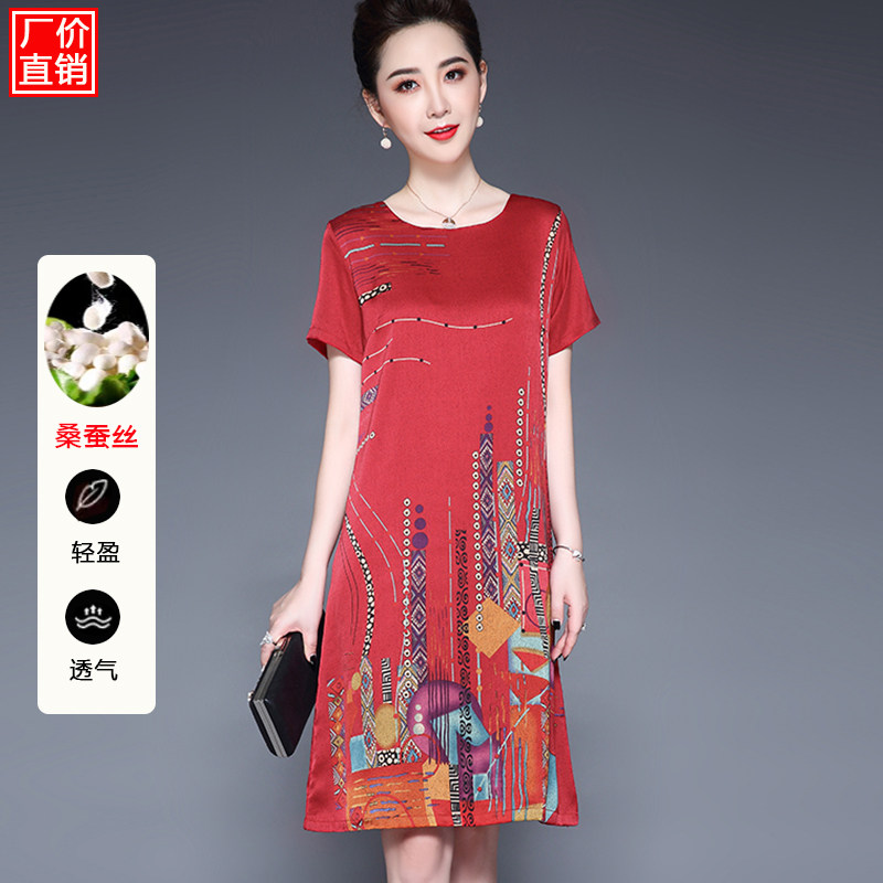 真丝桑蚕丝连衣裙女夏季新款圆领短袖印花中长裙休闲中老年妈妈装