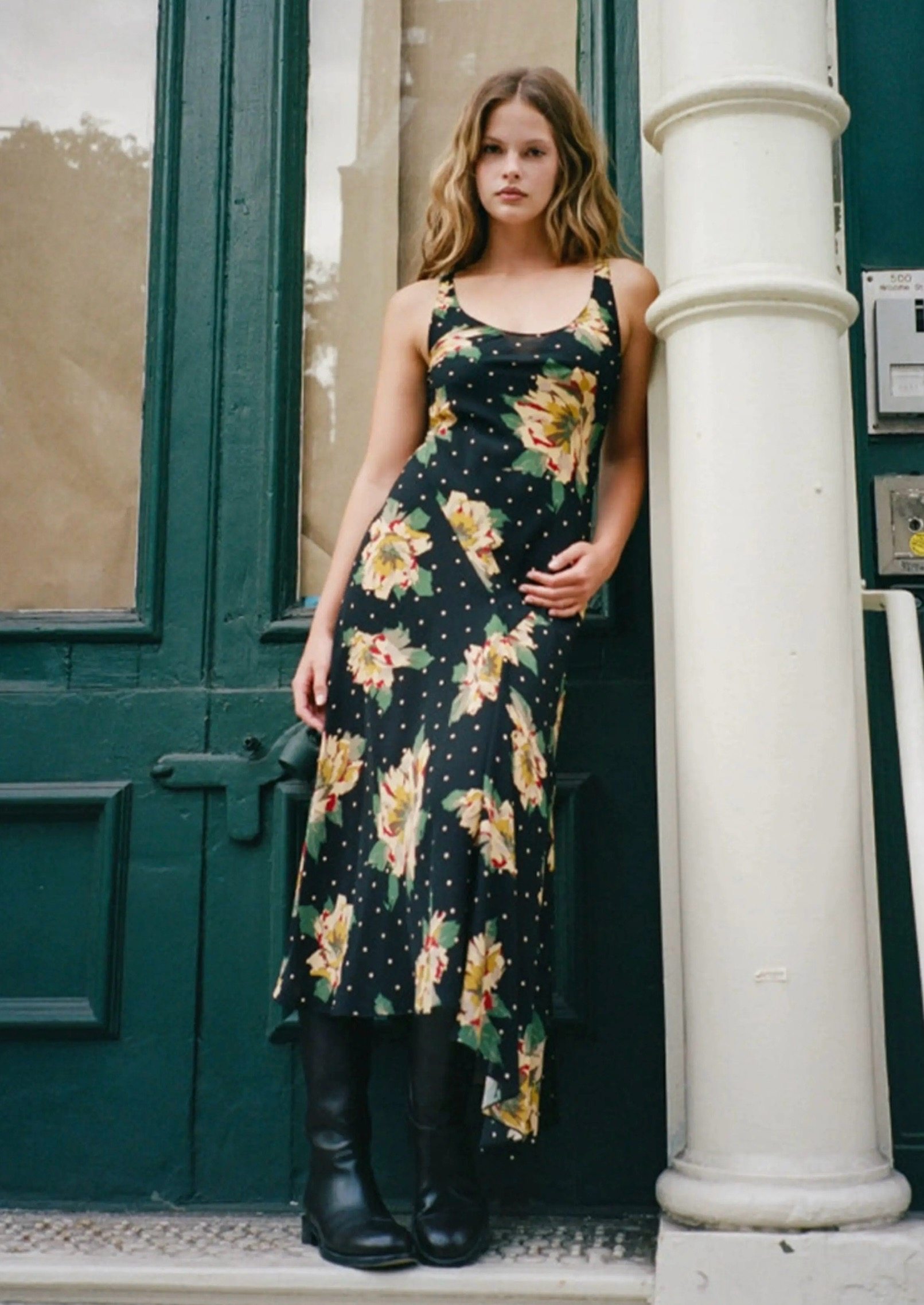 Aiyu轻奢真丝斜裁浪漫印花吊带连衣裙2025新款度假休闲百搭长裙