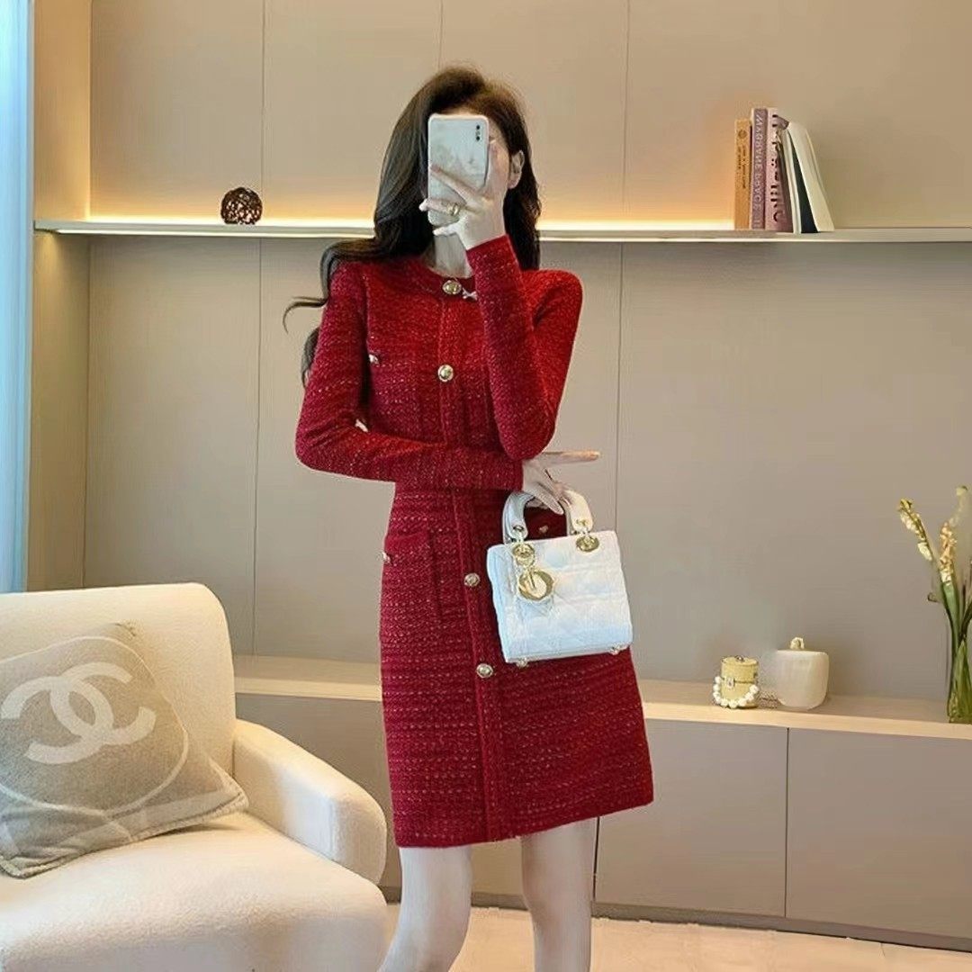 欧洲站新款时尚名媛赴宴约会红色小礼服女气质小香风打底连衣裙女