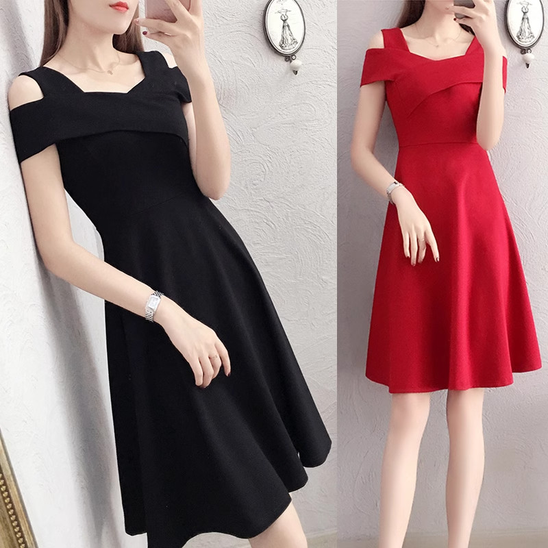 一字领露肩连衣裙女夏季小黑裙赫本风修身收腰显瘦红色小礼服个子