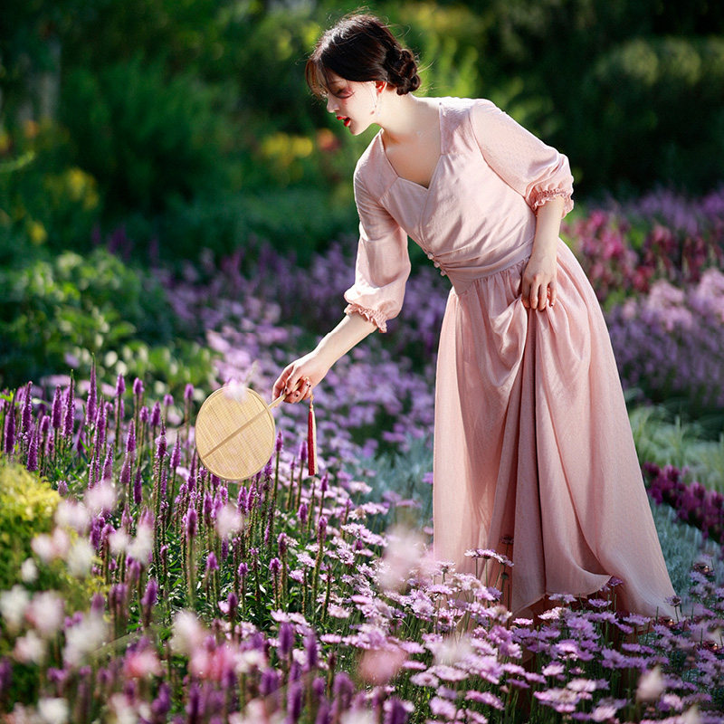 颂宋 夏季新款粉色印花雪纺连衣裙女V领碎花长裙子DT1396