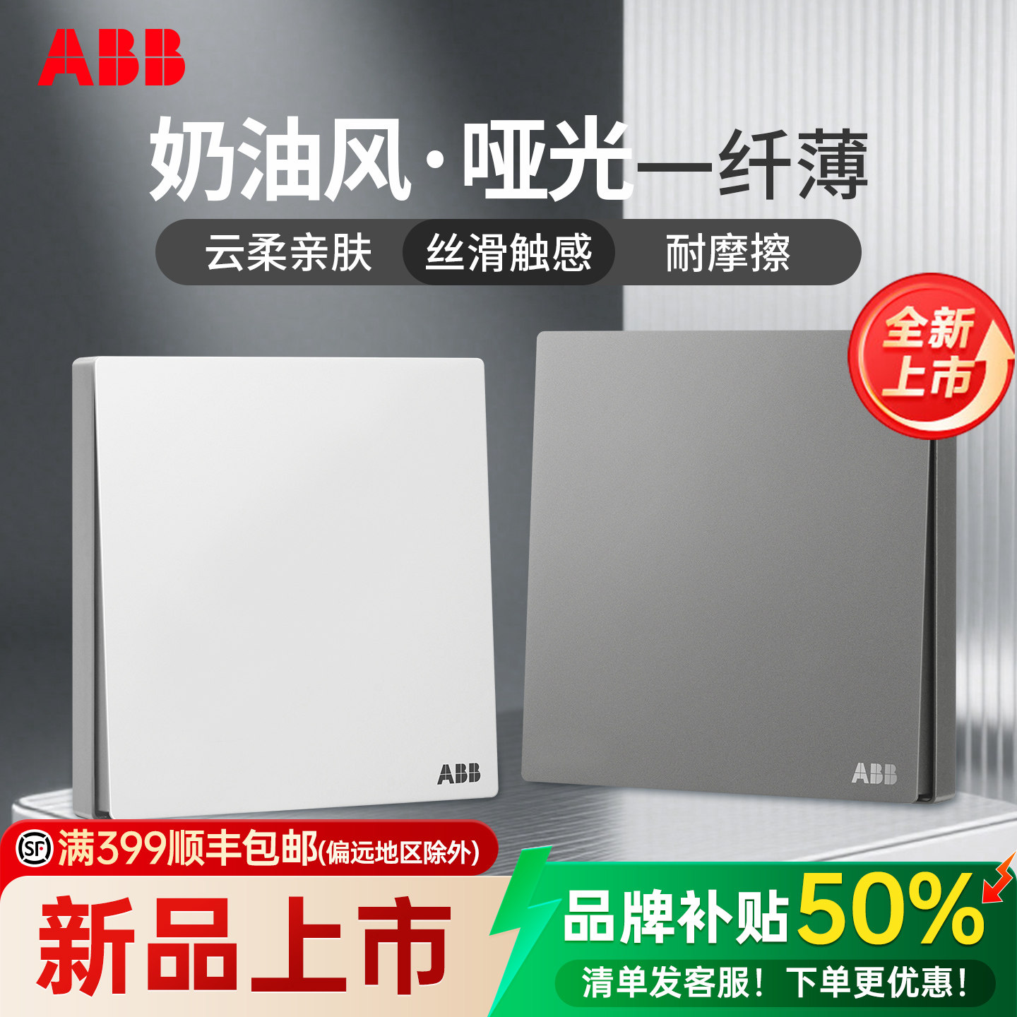 ABB德典一开单控开关 白灰金纯平无框面板阻燃防触电超薄设计