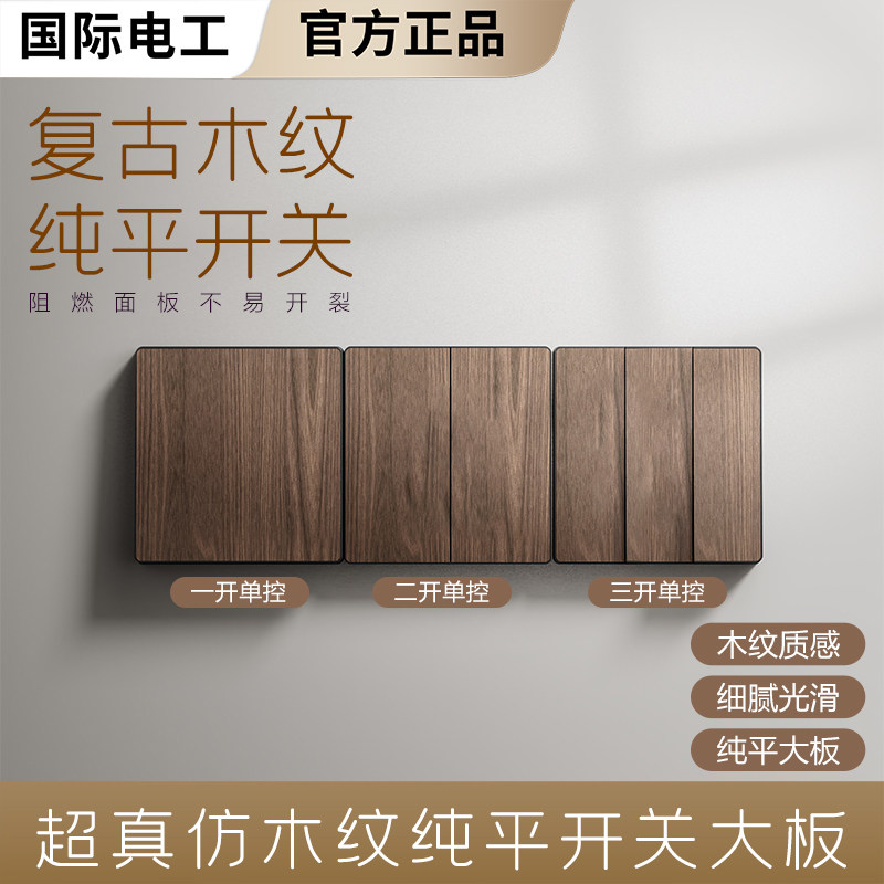 国际电工纯平单控开关仿木纹一开单控面板86型家用墙壁灯按钮开关