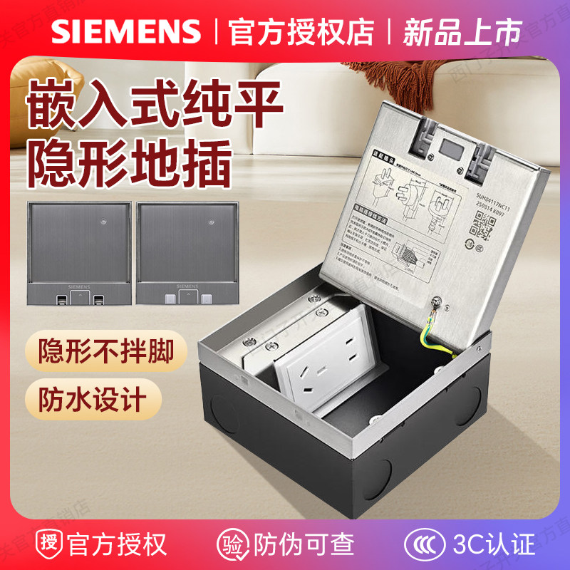 西门子银色纯平嵌入式地插五孔插座自定义改贴面家用地插底盒官方