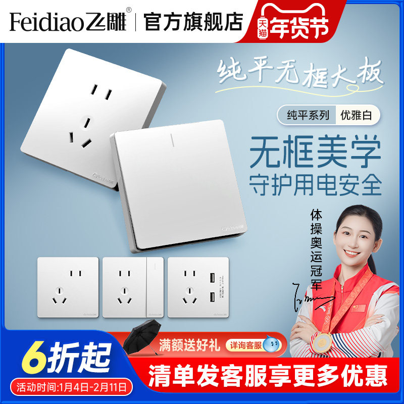 飞雕官方旗舰店开关插座面板多孔家用86型开关一开五孔插座纯平白