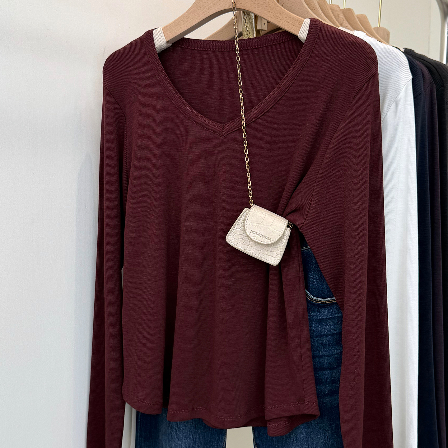 简约v领纽扣螺纹t恤衫女正肩长袖打底衫秋冬显瘦日常净色上衣ins