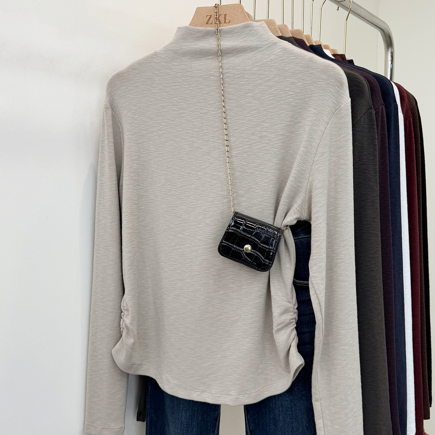 韩系半高领纯色女秋冬装小众设计感两边抽褶设计显瘦内搭长袖上衣