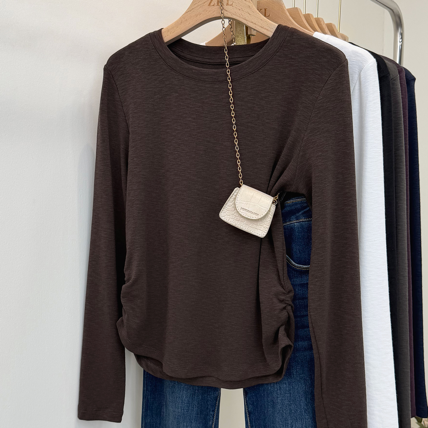 洋气纯色褶皱收腰打底衫女2025秋冬纯色内搭显瘦正肩上衣T恤长袖