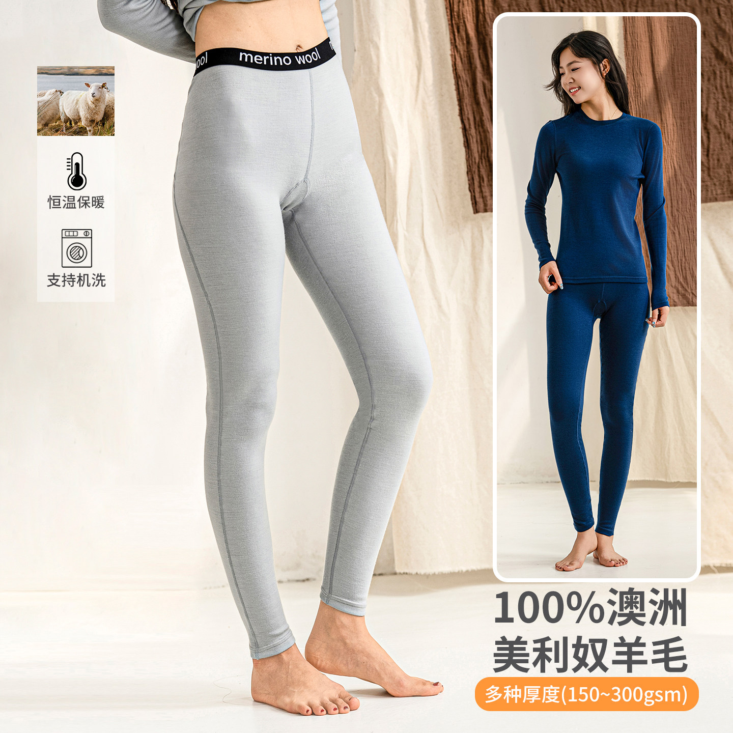 美利奴羊毛打底裤女户外速干裤美丽诺秋裤徒步登山长裤厚300g/m²