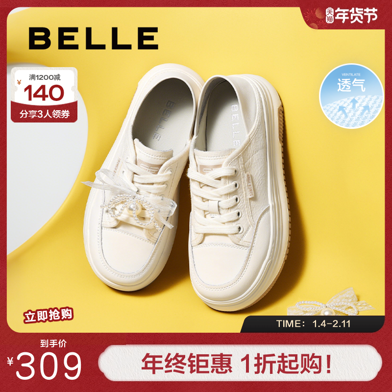 百丽女鞋子蝴蝶结厚底休闲板鞋新款增高鞋踩脚两穿小白鞋D7W1DAM5