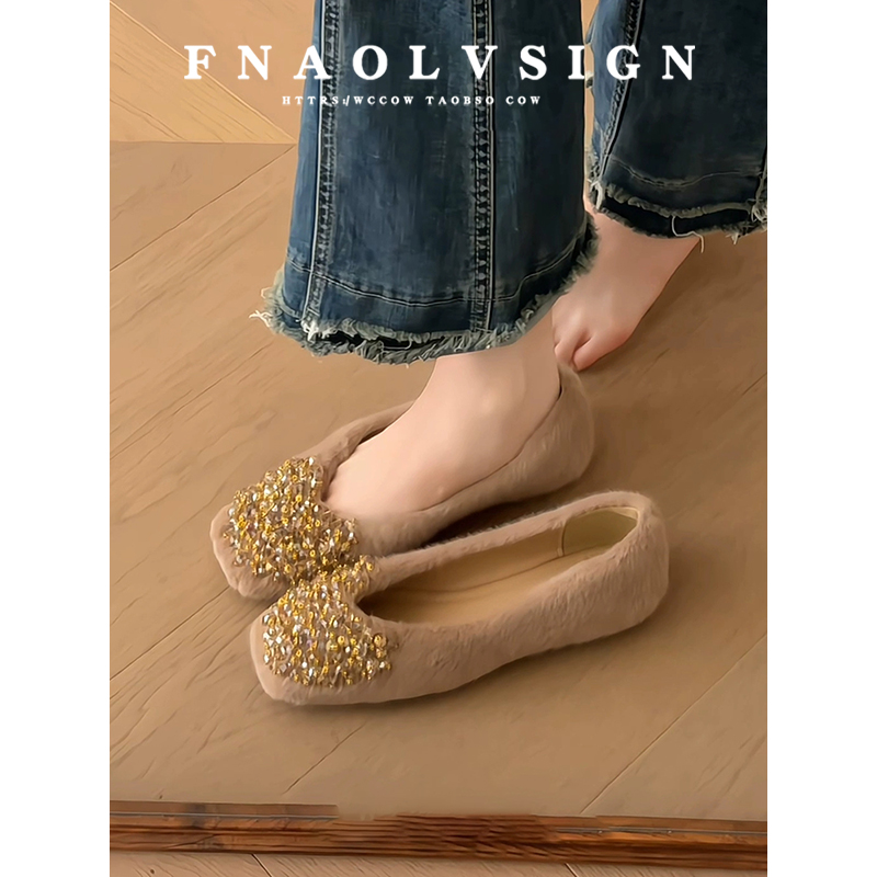 羊皮版~小香风毛毛鞋外穿平底加绒单鞋水钻玛丽珍鞋百搭软底瓢鞋
