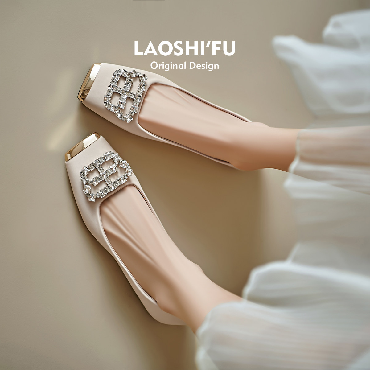 羊皮版!法式水钻方头平底单鞋女2025春新款软底配裙子晚晚鞋瓢鞋