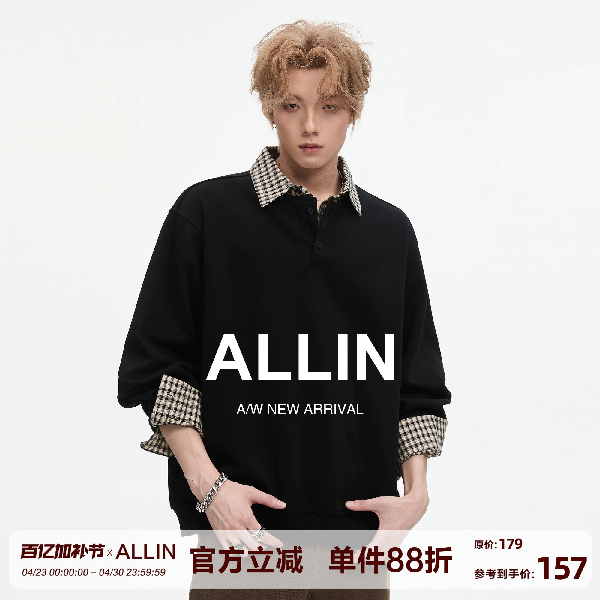 ALLIN 复古假两件衬衫拼接翻领卫衣男春秋季潮牌宽松情侣休闲外套