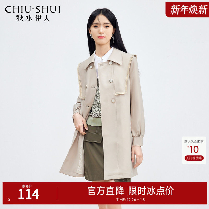 秋水伊人卡其风衣女2025新款秋装女装海军领双排扣系带风衣外套