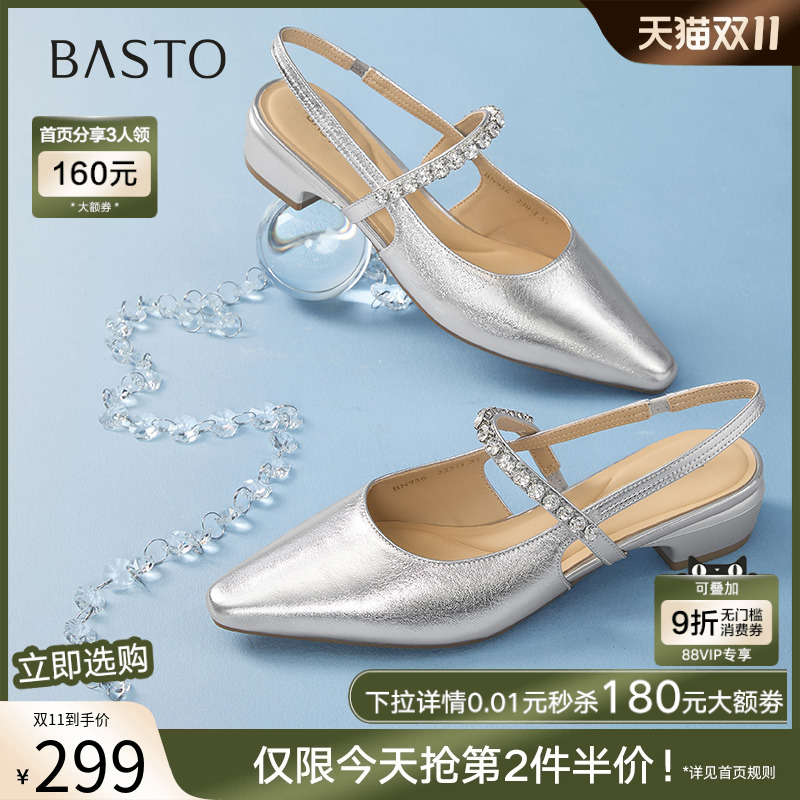 百思图2025夏新款气质尖头粗跟后空女玛丽珍凉鞋银色单鞋BN956BH5