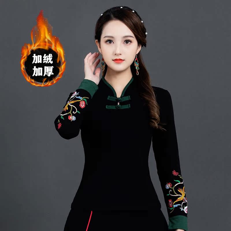 民族风长袖加绒保暖绣花打底衫 冬季立领中国风盘扣上衣刺绣t恤女