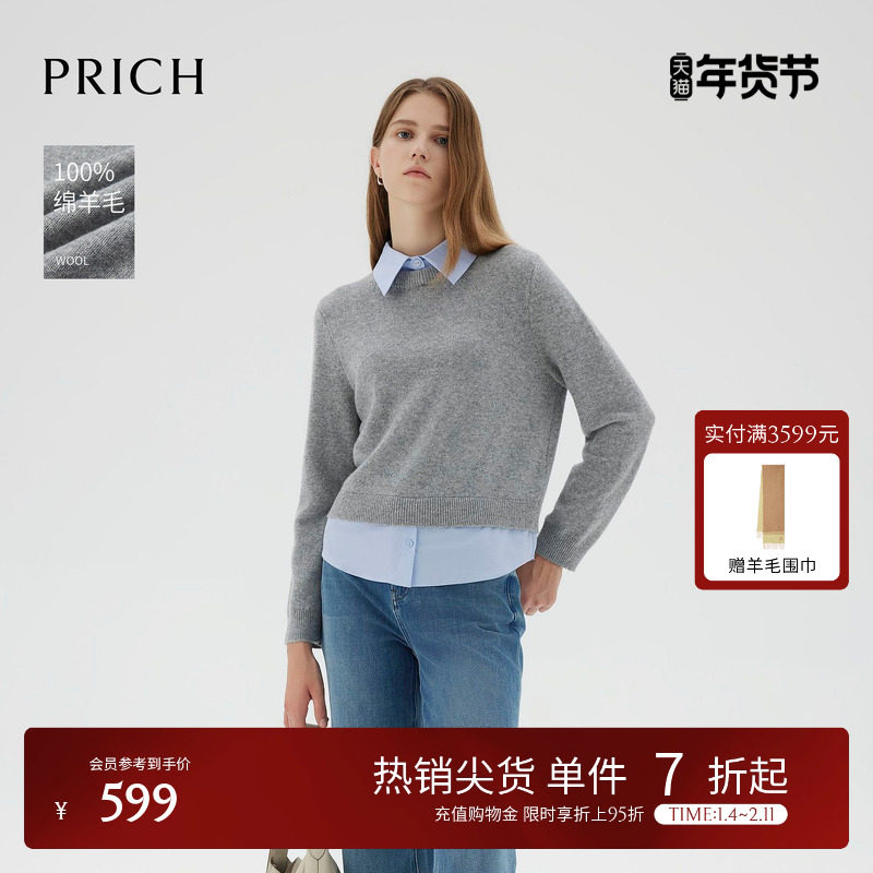 【绵羊毛】PRICH时尚格雷系假两件衬衫领针织衫2025冬新款毛衣女