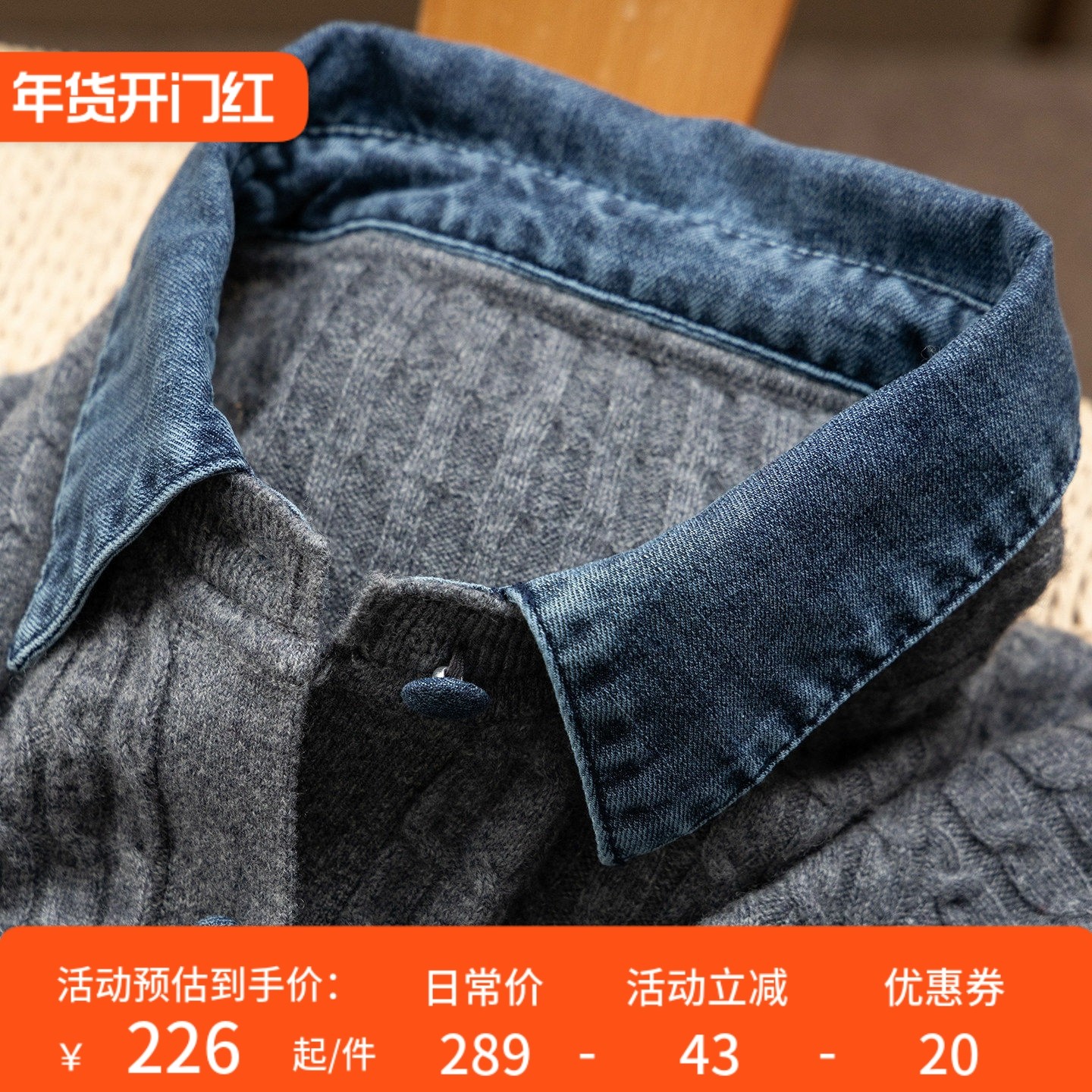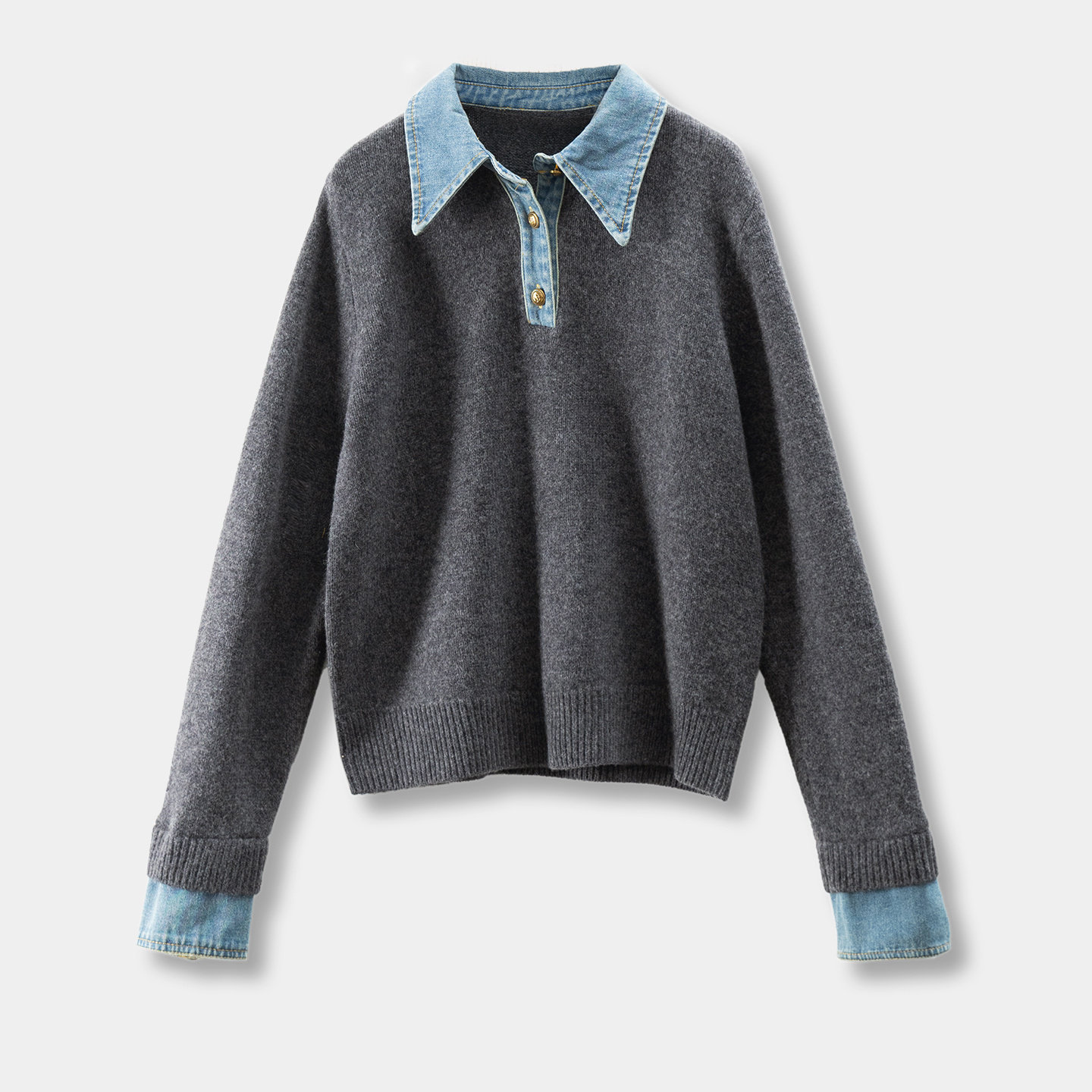 H春上7号 时髦不费力 法G拼接牛仔100羊毛衬衫领假两件毛衣女29I0