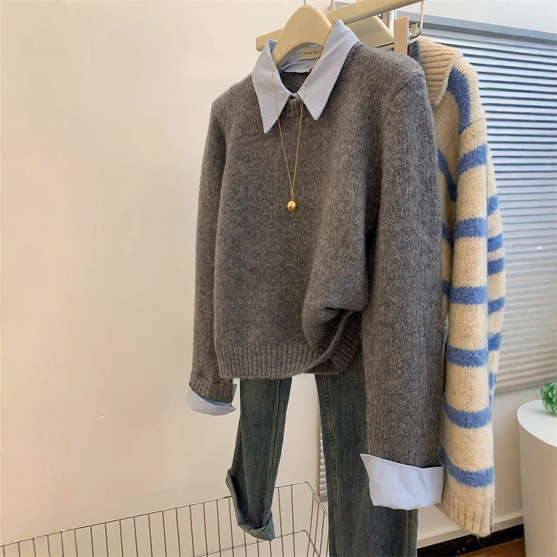 假两件衬衫领针织毛衣女秋冬装文艺范毛衫宽松通勤上衣打底女士潮