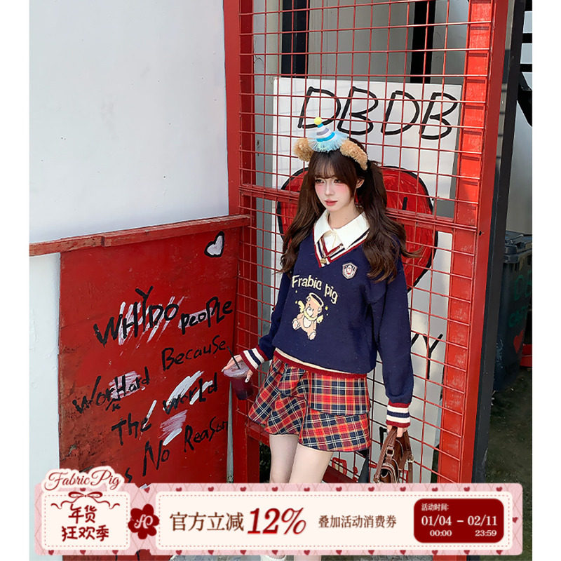 织物猪 小熊补习班 学院风衬衫领假两件毛衣女冬可爱宽松针织上衣