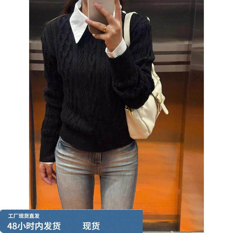 黑色拼接衬衫领假两件毛衣女秋冬欧货软糯麻花内搭针织打底衫上衣