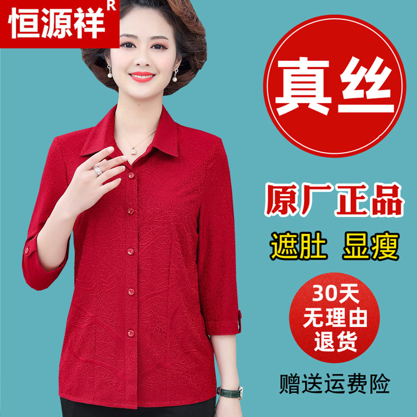 恒源祥妈妈真丝衬衫薄款大码夏季50中长袖衬衣女中老年桑蚕丝上衣
