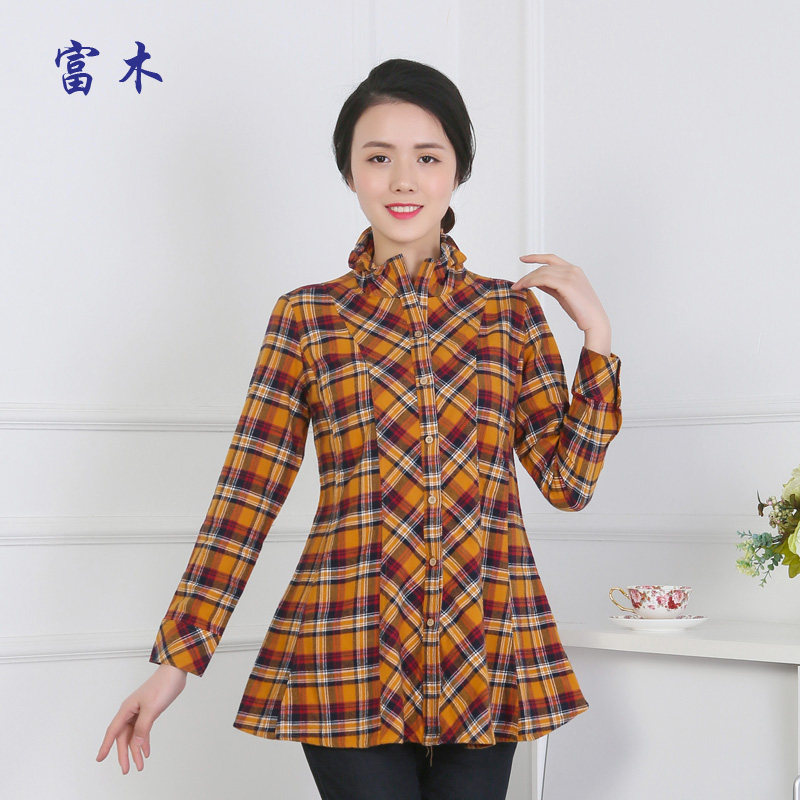 富木春秋新款女中老年格子衬衫纯棉中长款收腰显瘦衬衣WZ-17007E7