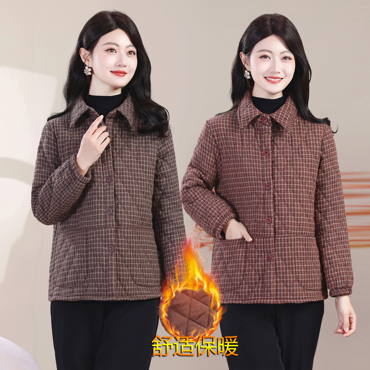 复古风格纹衬衫女中老年妈妈装长袖翻领显瘦遮肉保暖夹棉格子棉衣