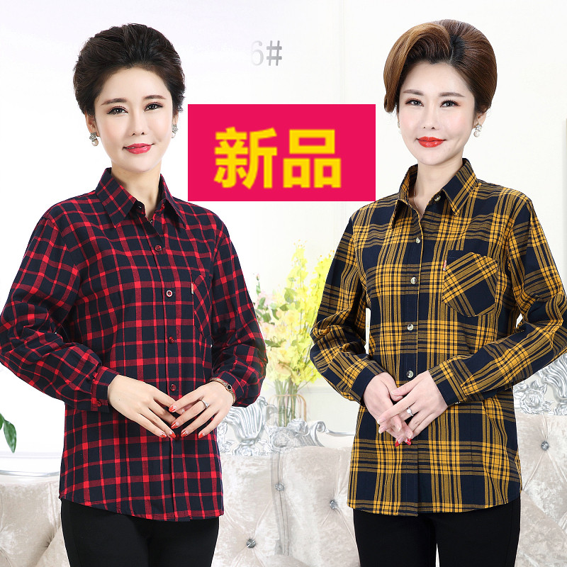 中年妈妈女装春秋纯棉长袖格子衬衫女中老年人大码衬衣女士外套新
