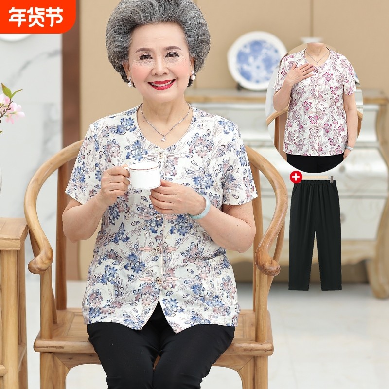 奶奶夏装短袖套装冰丝女中老年人衬衫妈妈夏季休闲老太太凉快衣服