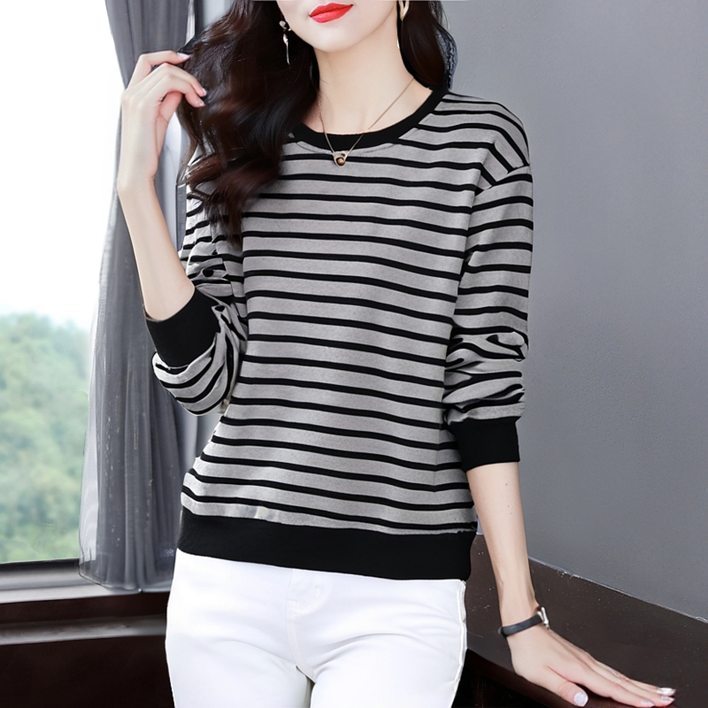 好看时尚漂亮百搭卫衣女新款条纹长袖t恤女款中年妈妈上衣打底衫